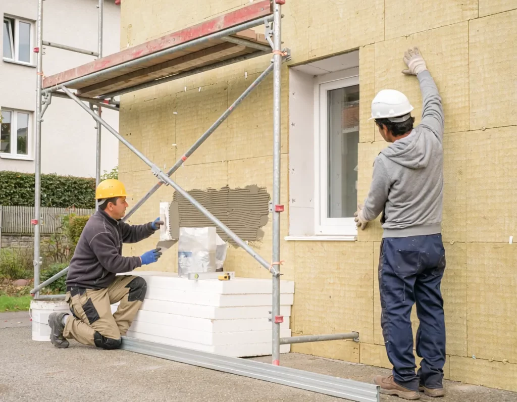 Comment ça fonctionne : on fixe des panneaux isolants directement sur la façade existante, puis on applique par-dessus un enduit de finition ou un bardage. Le bâtiment garde toute sa surface habitable, et les ponts thermiques sont éliminés là où les pertes de chaleur sont les plus importantes.